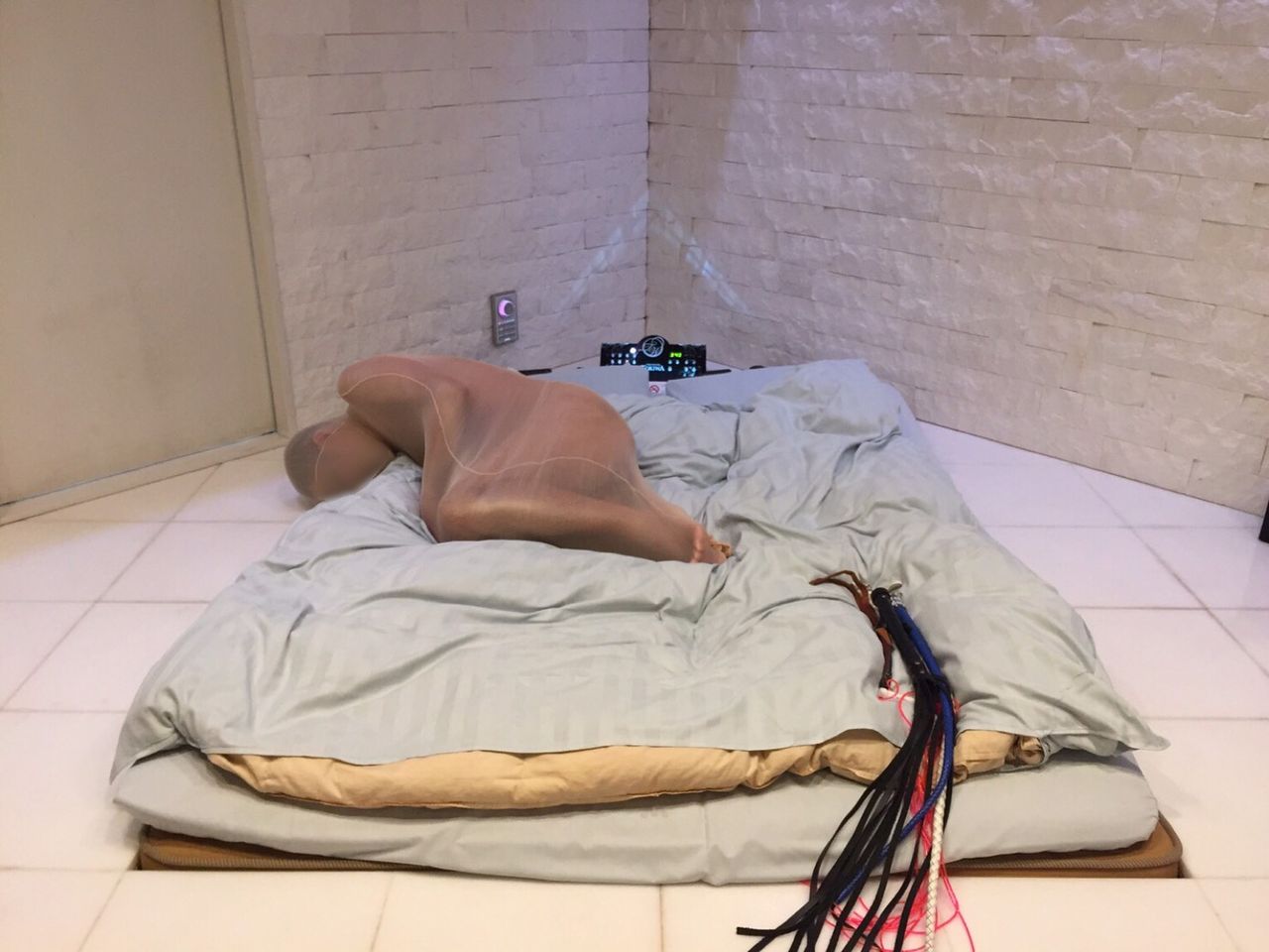 本当はベッドの真ん中に寝てもらいたかったんだけどうまくいかなかった。けどこれはこれでお気に入り!な画像です。全身入る筒型ストッキングに入れて袋叩き。こんにちは、リオです。